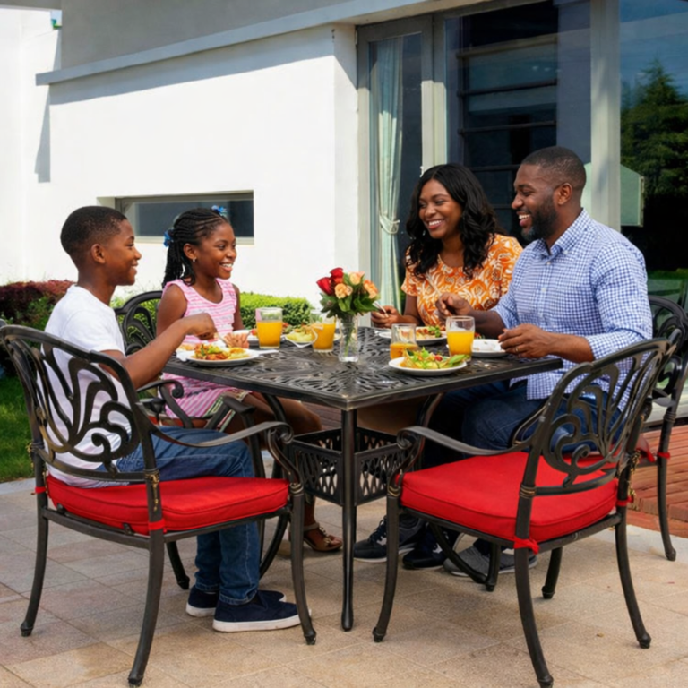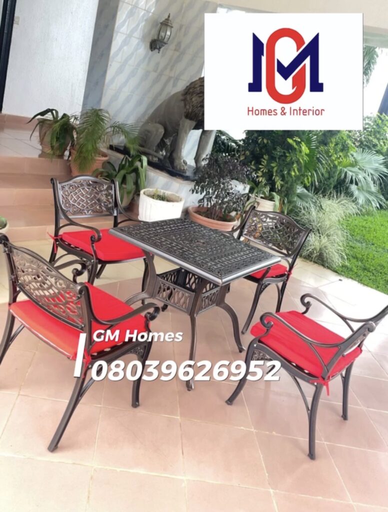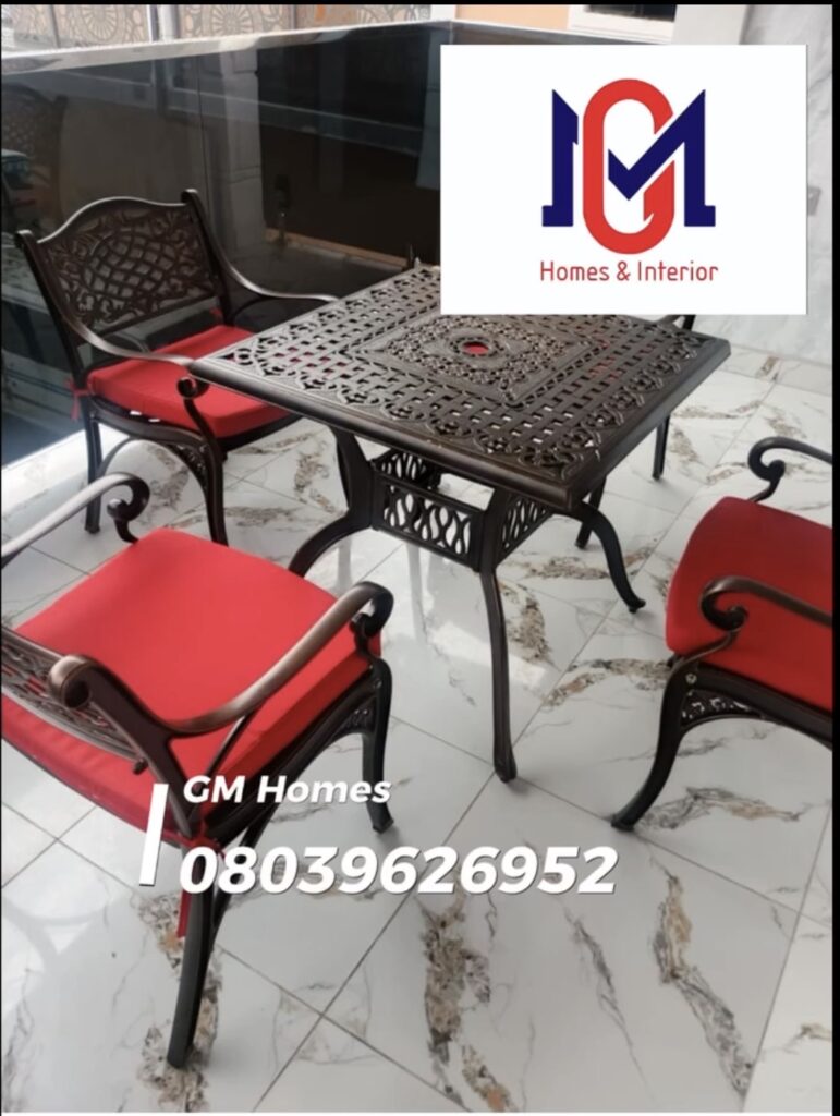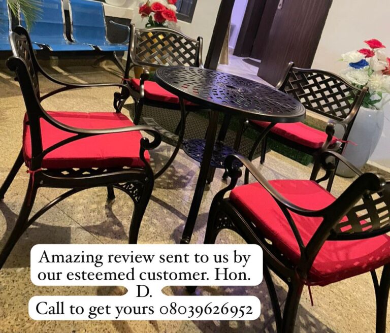 It is built to handle Nigerian weather and daily use without stress, combining a solid cast aluminum dining table, four strong and well-balanced chairs.