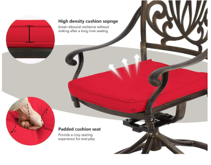 It has thick, comfortable cushions for every seat, all perfectly matched to work together, so you enjoy a sturdy, comfortable, and polished outdoor dining setup without the need to buy anything extra or make additional adjustments.